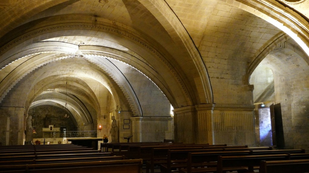 Unter der Kirche existiert noch von der Vorgängerin eine weiträumige Krypta mit dem Grab des Heiligen St. Gille. Überraschend gibt es dort auch einen Brunnen, der noch Wasser enthält. Die ehemalige Treppe in die Kirche existiert noch, führt aber nur noch bis an den neuen Kirchenboden. Ein ähnliches Kuriosum ist ein Stück Wendeltreppe, das außen in der Luft beginnt und oben im Nichts endet, da sie vom Vorgängerbau übrig gelassen wurde.