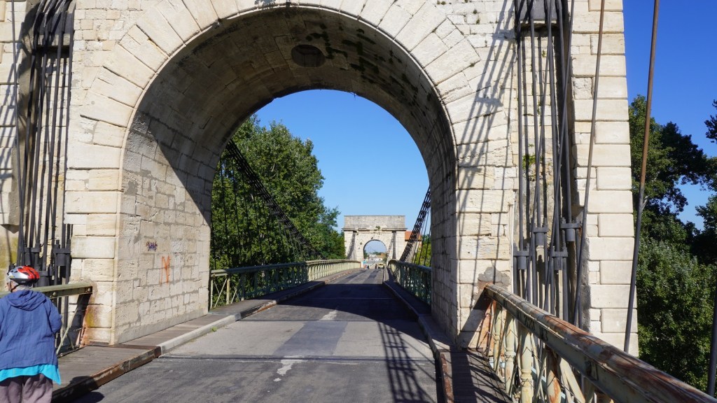 Bei Fourques überquerten wir die „Kleine Rhone“. Diese alte Brücke ist seit kurzem für den Autoverkehr gesperrt und wir konnten die Überfahrt entspannt genießen. Damit waren wir auch schon in Arles. Im Zick-zack führte man die Fahrräder durch eine Siedlung, um dann auf einmal in einen Tunnel unter der Autobahn einzutauchen.