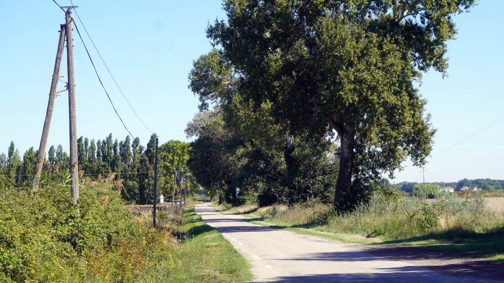 St. Gilles liegt nur etwas über 20km entfernt von Arles, also durchaus mit dem Fahrrad machbar. Auf der Karte ist noch eine Eisenbahnlinie eingezeichnet, aber von der ist nur noch die Trasse erkennbar. Außerhalb des Städtchens fanden wir ein Fahrradweg-Zeichen, das uns weg von der Hauptstraße, zuerst in ein Industriegebiet und dann durch die Felder führte. Die Straße war nur für 70 km/h zugelassen, da sie als Fahrradroute ausgeschildert ist.