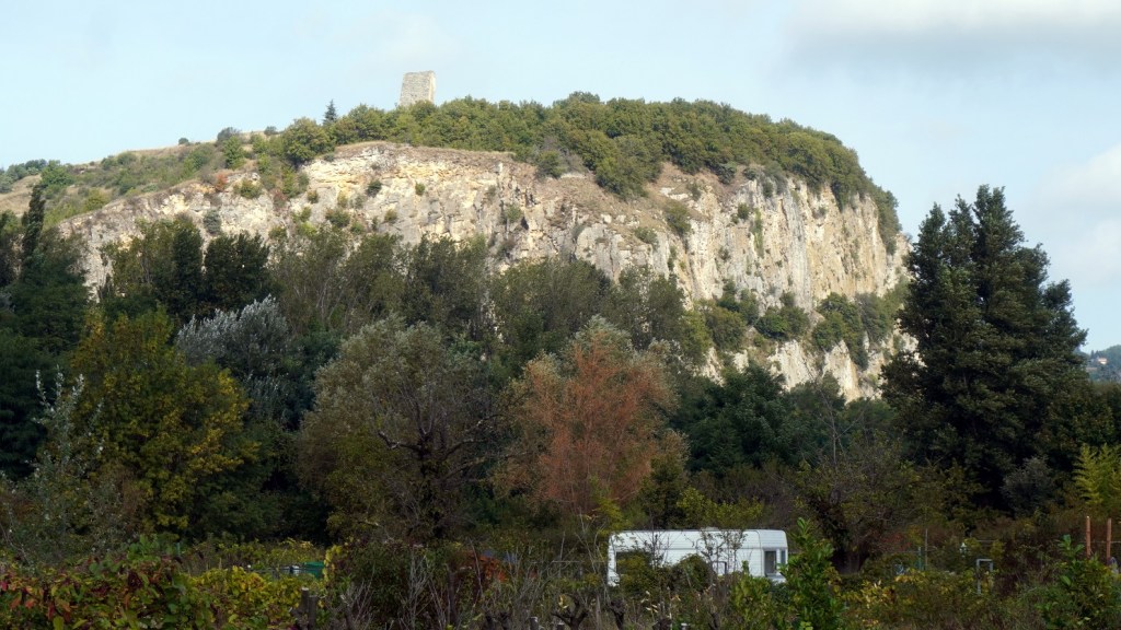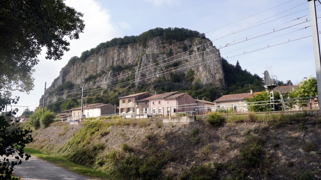 Nach dem das Wetter heute noch mal mitgespielt hat, fuhren wir heute von Campingplatz aus nach Norden. Die Wege waren wie schon gestern durchgehend in gutem Zustand und gut ausgeschildert. Als erstes sahen wir auf der Höhe den „Tour penchée de Soyons“. D 86 und die Eisenbahn fahren knapp am Felsen entlang, wovon wir am Ufer der Rhône nichts mitbekommen.