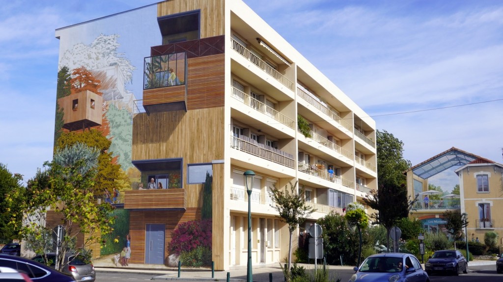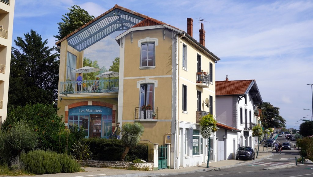 Wir haben uns für 2 verschiedene Gratins entschieden und suchten dann den kürzesten Weg zum Rhôneradweg zurück. Der Besuch in einem riesigen Auchan-Supermarkt kostete dann noch etwas Zeit. Im Ort Guilherand-Granges sahen wir noch 2 vortrefflich gestaltete Hauswände. Dann hatten wir den Rhôneradweg wieder erreicht und wir kämpften uns gegen den Wind zum Campingplatz zurück.