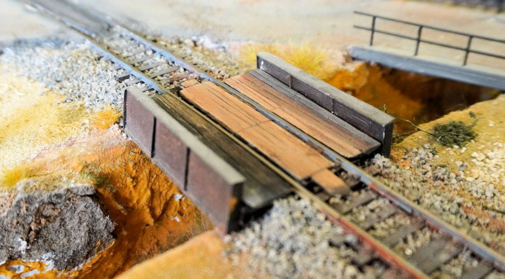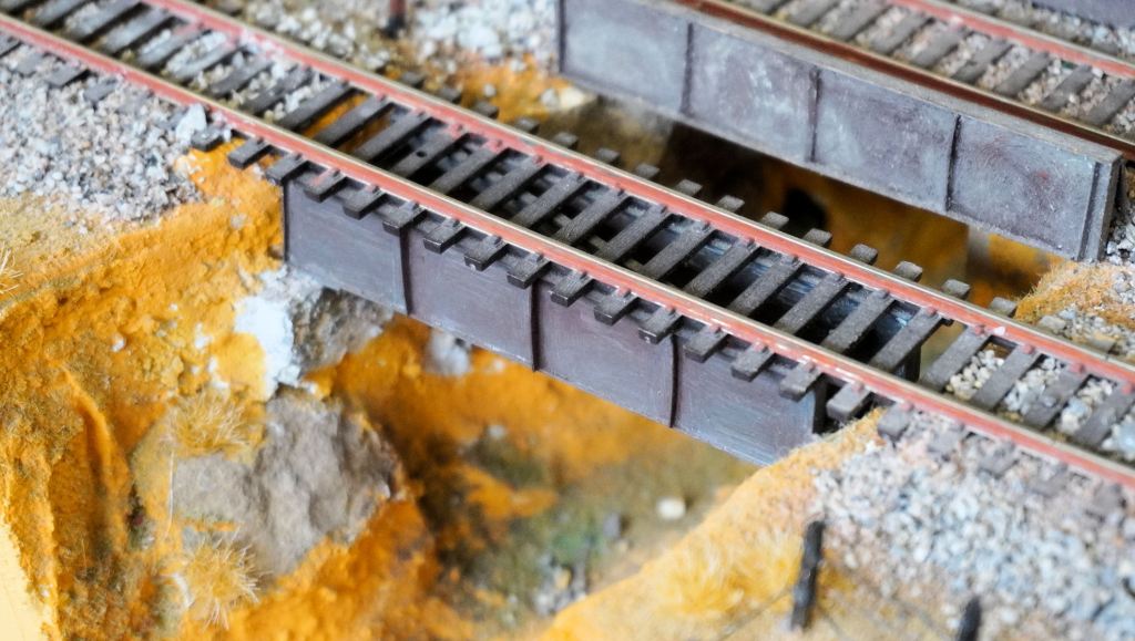 Bei der Schwelle ist zu beachten, dass sie am Ende zweier Schwellen der Weiche zum Liegen kommt, das bestimmt deren Länge. Da wo einmal die Schiene lag, feilte ich eine Delle mit einer Rundfeile, um eine gute Auflage für den Zylinder zu haben.